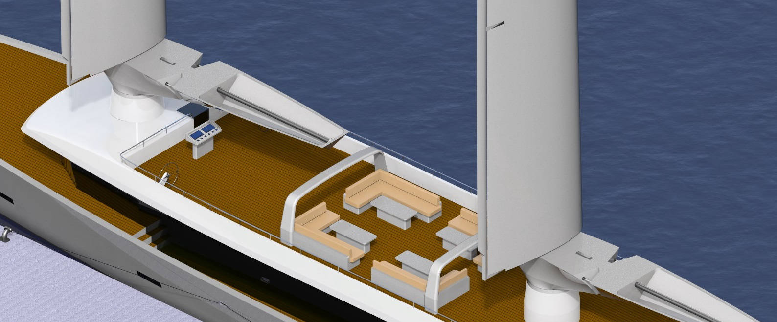 Halyards operations, captive winches, hooks and other technical fittings will be located inside the wing-mast, for a total free ropes appearance.